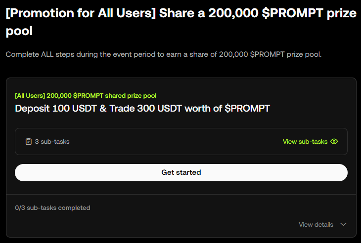 | 전체 사용자 이벤트 | 누구나 | 100 USDT 순입금 + 300 USDT 거래 | 200,000 $PROMPT 공유 |