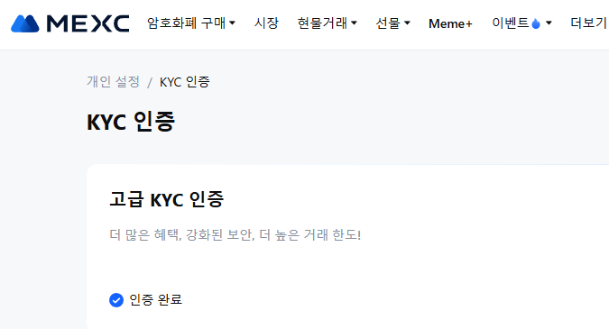 - MEXC에서는 KYC(본인인증)를 진행해야 출금 한도가 늘어나고 거래가 원활하게 가능합니다. 신분증 사진과 셀카를 제출하면 하루 이내로 인증이 완료돼요.