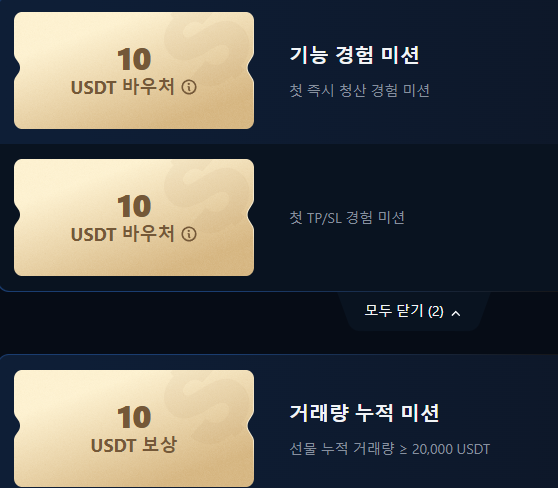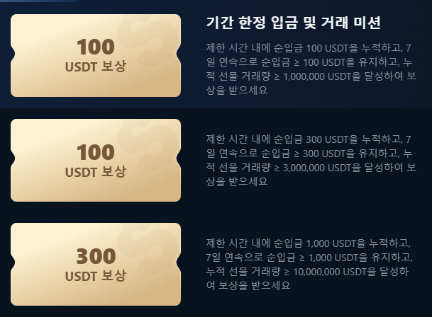 MEXC는 신규 회원을 위한 다양한 보상을 제공하고 있습니다. 회원가입 후 특정 미션을 완료하면 USDT(테더) 보상 및 바우처를 받을 수 있습니다.