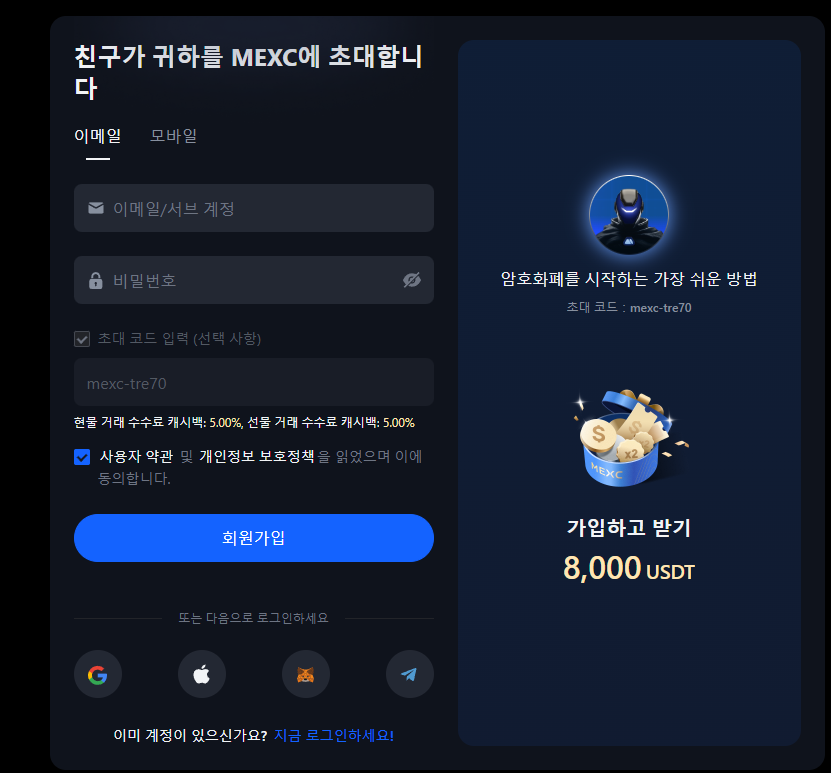저는 이중에 3곳정도 거래소를 가입했는데 해외거래소중 신규가입 혜택은 mexc가 좋은 편이더라고요.